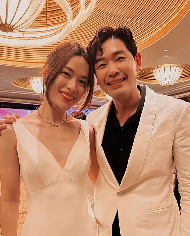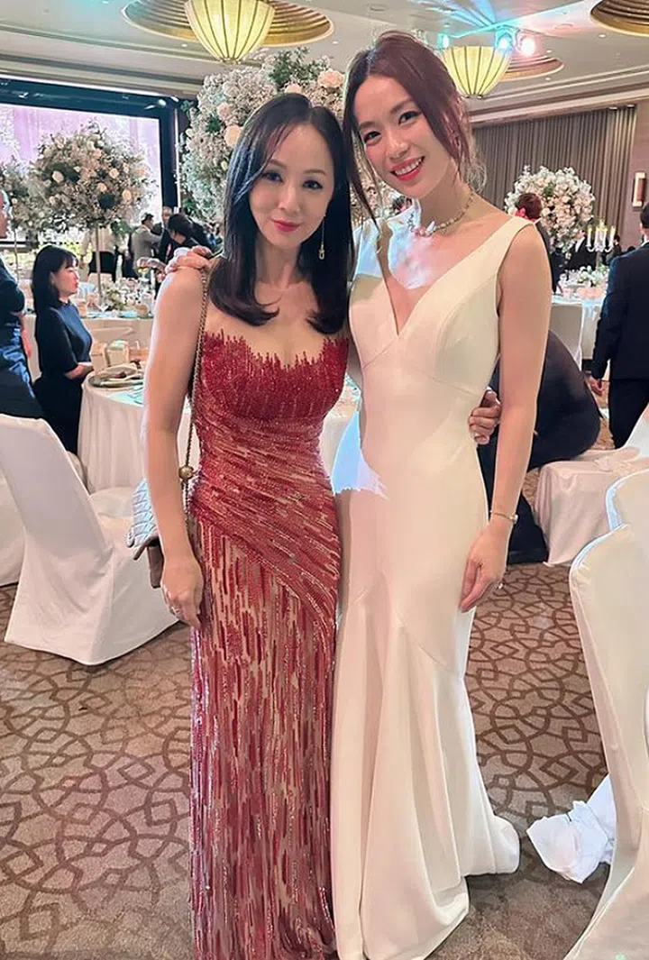 最近为各大国际奖项而忙碌奔波的洪慧芳,当晚可不是“Ajoomma”。她穿上简单的红色礼服,与丈夫郑各评演绎“红白配”,祝福一对新人。