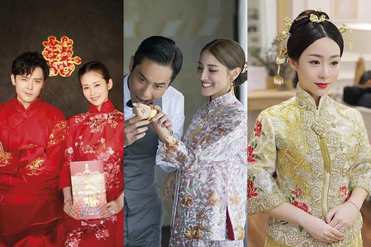本地男星徐彬的模特妻子,当时在婚礼上“金闪闪”的中式造型一亮相,就惊艳了不少人。传统的黑发红唇,加上服帖整齐的发型,一身金丝裙褂加金头饰,俨然具有古代宫廷范。尽管搭配的是现代首饰,但与衣服上的钻石缀饰相呼应,并不显得突兀。