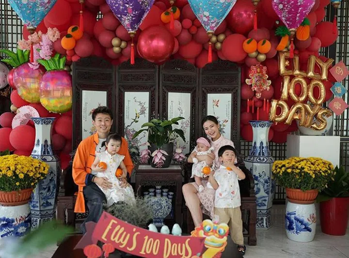 今年农历新年初一,也是Cheryl家中第三宝Elly的百日,可谓双喜临门!一家五口在既充满新春氛围,又格外洋气的百日主题布置中合照,隔着屏幕也能让人感受到热闹与和乐。