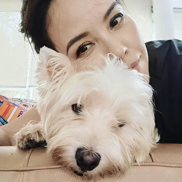 阿姐郑惠玉也是个爱心满满的人,共有三只爱犬,其中两只一黑一白的狗狗是领养而来。白色的狗狗Kiki是一只退休了的育种狗,被阿姐领养回家后细心照顾,宛如雪球般Q萌惹人爱,阿姐也为它开通了IG帐号@snowball_ki_k。阿姐非常疼爱三个毛小孩,会轮流带它们出门一起运动,把它们打扮得美美,让狗狗每天都过得很幸福!