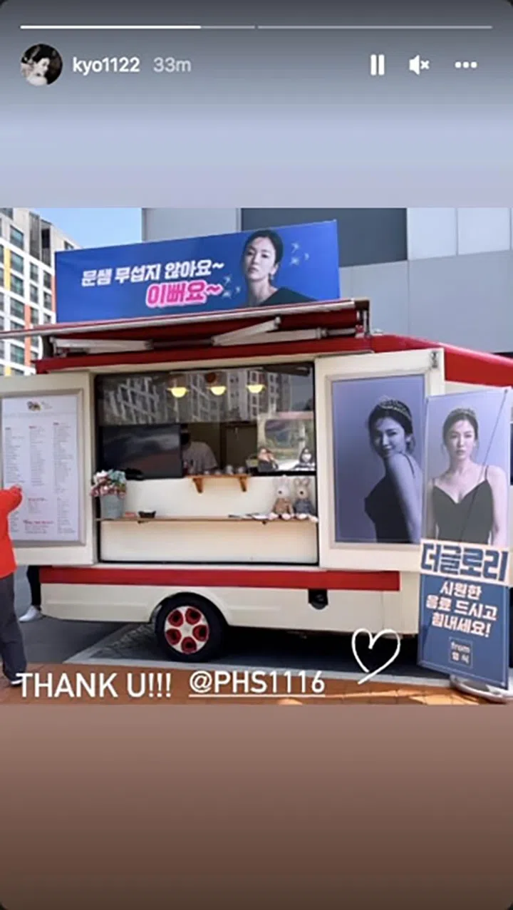 宋慧乔正在赶拍 Netflix 原创剧《荣耀》,人缘好的她经常收到演艺圈好友的应援餐车到片场,为她打气。早前她特别在IG动态上传应援餐车的照片,并标注“送礼人”的账号,原来对方就是韩国新一代大势男星朴炯植,两人的好交情也引发网友热议。