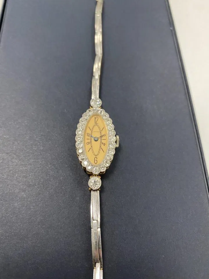 作为Longines品牌之友的她,婚礼当天配戴了品牌1916年的镶钻18K金及铂金古董腕表,展现高贵又端庄的古典气质。