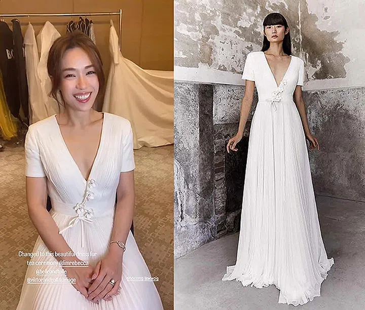 据林慧玲及其好友化妆师Shaun Lee的IG分享,她当日穿着的这套婚纱来自荷兰二人组设计师品牌Viktor&Rolf(售于Bell&Tulle Bridal)。设计师Viktor Horsting与Rolf Snoeren以两人的名字于1993年创立该品牌,致力将时尚当作艺术来打造。同时两人在2015年决定结束成衣系列,将重心转向高级订制服及香水事业,专注于创作不受时间和创意局限的精良作品。