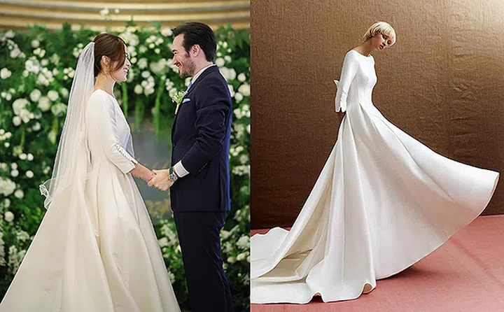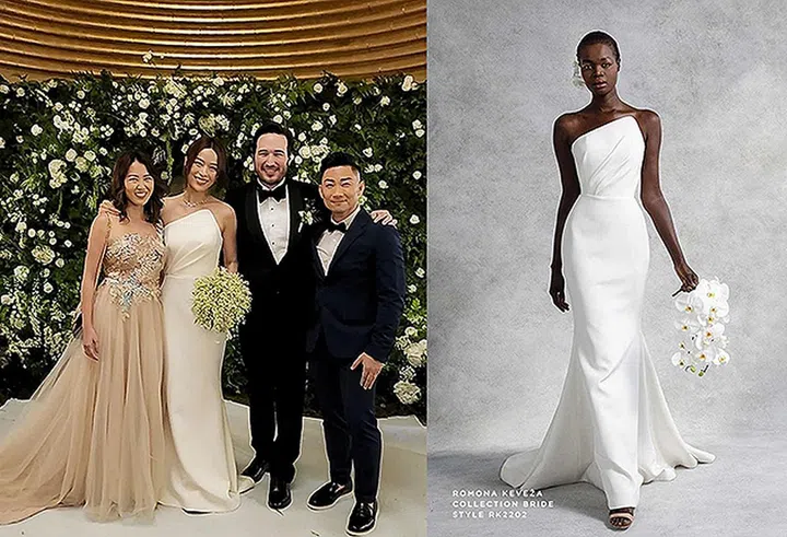 这款不对称设计的婚纱同样源自Bell&Tulle Bridal礼服店(位于Paragon三楼),不过是来自另一品牌Romona Keveza。该品牌由立陶宛裔加拿大设计师Romona Keveža成立于1999年(纽约旗舰店于2014年开业),其设计的共同点也是主打极简主义风格。另外,该品牌每季致力为不同身型的新娘打造,从size 2到size 32的尺寸均有,充分体现品牌的包容性。