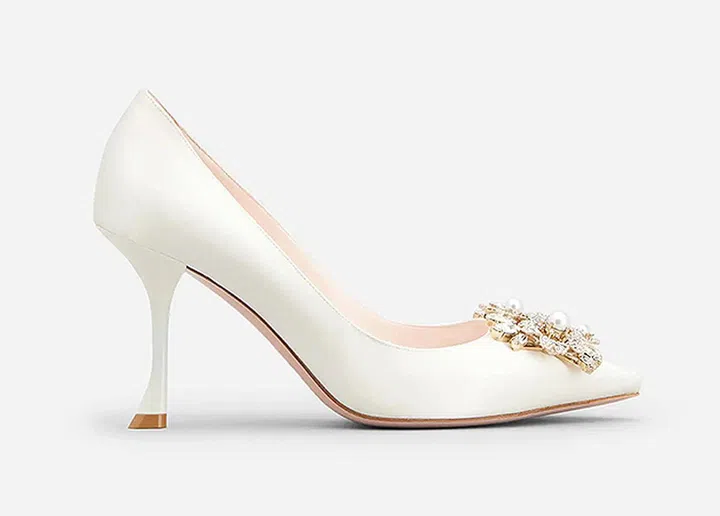 另外,她还穿着了这双来自Roger Vivier Bridal婚鞋系列的RV Bouquet Strass Pearl Buckle缎质白色高跟鞋,完美搭配浪漫婚纱。