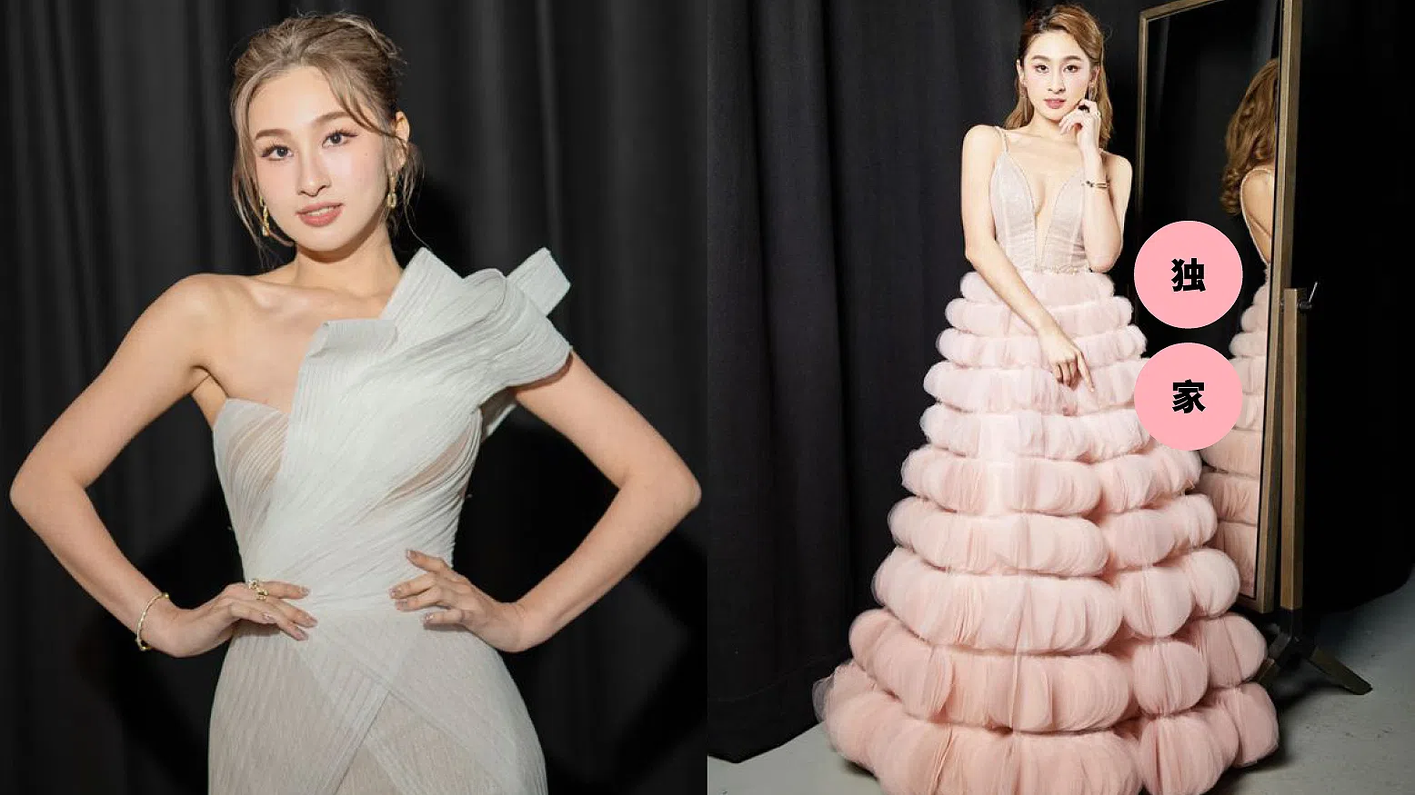 阳光可乐在红星大奖上的两套造型——左为2025年优雅的白色礼服,右为2024年浪漫的粉色蓬蓬裙。(图:阳光可乐提供)