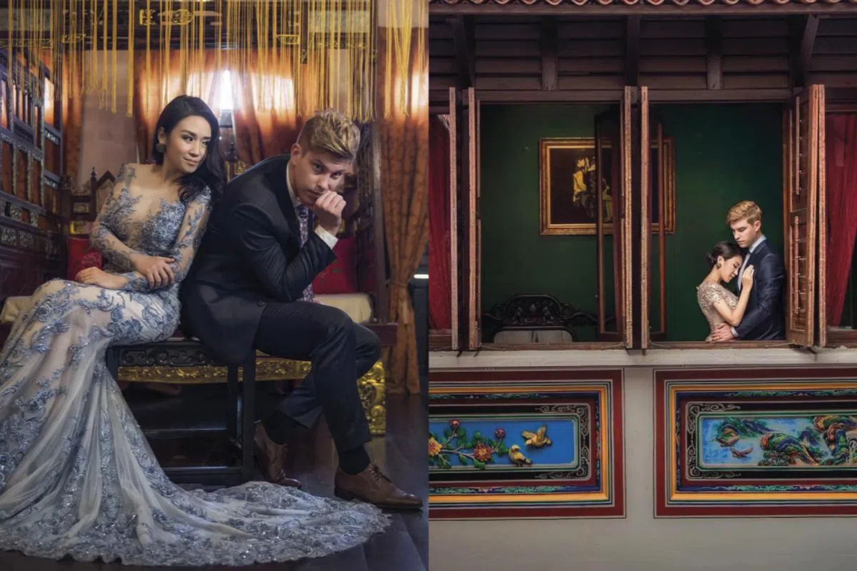 由于石欣卉与瑞典男友属中西结合,两人的婚纱照也十分有意思地诠释出了元素碰撞的华丽氛围。具有东方气息的家具与建筑,搭配两人一身的西式礼服,并无违和感。反而,两者共有的庄严感相互衬映,让华丽气息瞬间提升,显著分明。