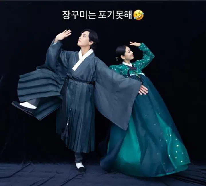 当然也有顽皮的一面。朴信惠还在IG story分享了一张和崔泰俊穿着传统礼服的搞怪照片,并表示:不能放弃淘气。实在太可爱!希望他们两人一直幸福下去。