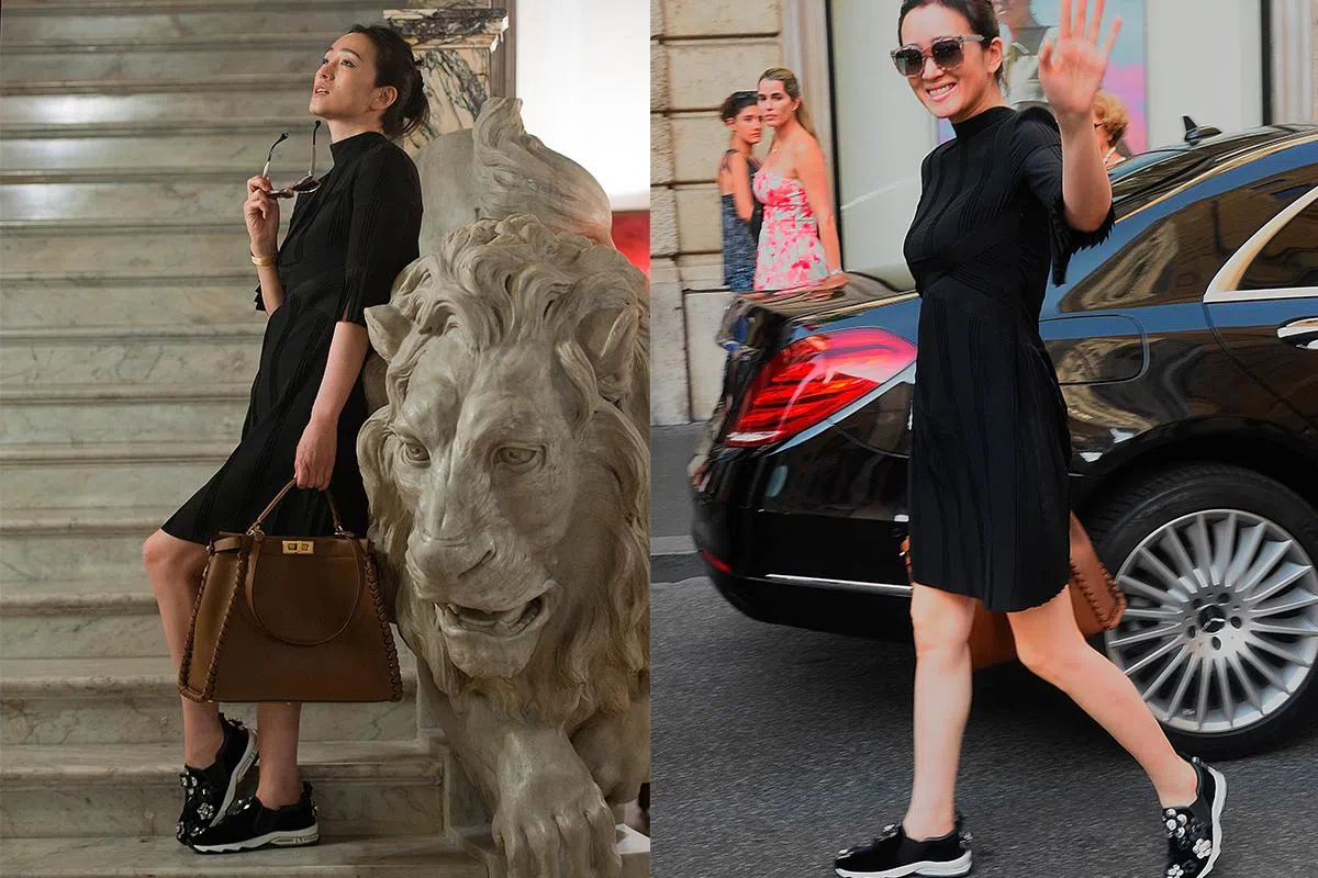 意大利时装品牌Fendi为庆祝90周年,特别回到发源地罗马,并选址著名许愿池举行时装展。国际巨星巩俐一抵达罗马,便以一身Fendi亮相街头:身穿Fendi 2016早秋系列的黑色连身短裙,手提今季全新啡色lace-up peekaboo,更佩戴上Fendi与法裔设计师Thierry Lasry合作推出的全新太阳眼镜,展现招牌笑容,整个造型优雅大方。