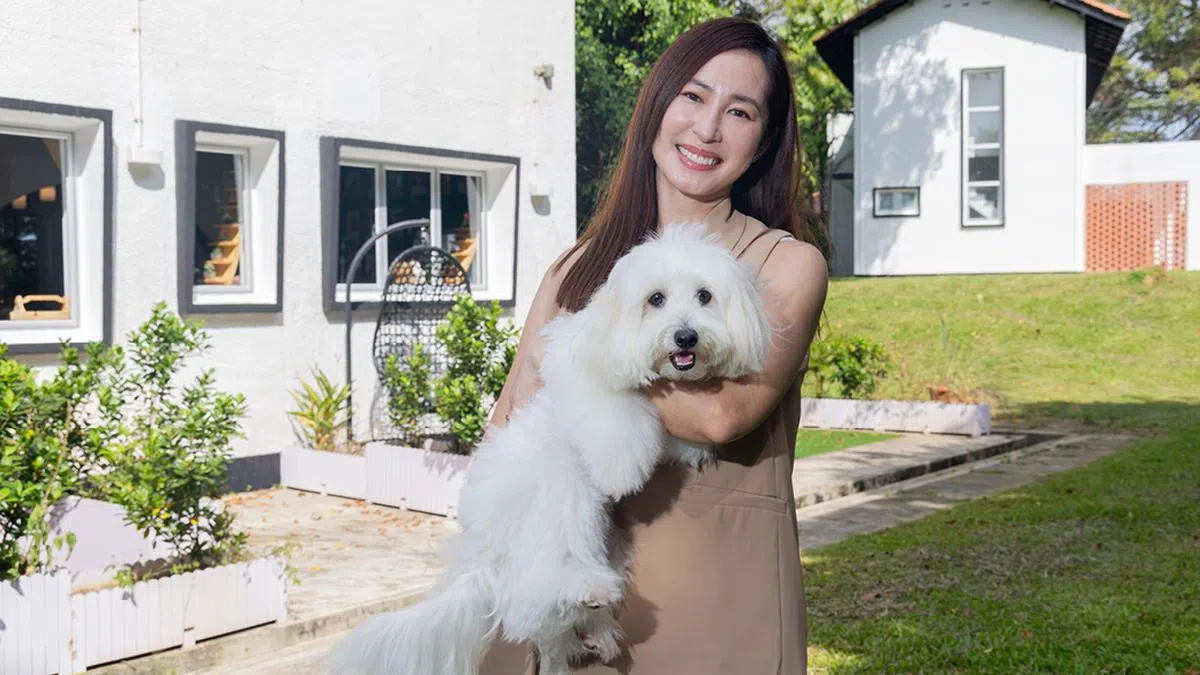 蔡琦慧在本地剧《宠他,还是爱我?》首次跟狗狗演对手戏,她手中抱着的就是她的搭档Picasso。(图:《早报》,吴先邦摄)