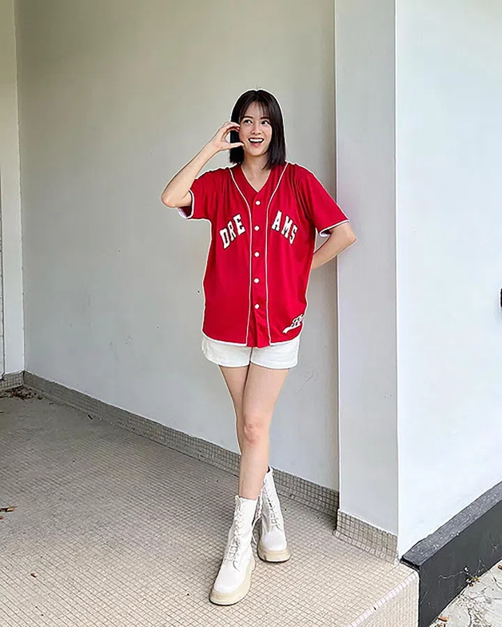 红色的球衣+白色短裤 —— 郑颖的国庆日造型十分“对味”!配上一双白色的高筒靴子,整体Look可是休闲又有型。