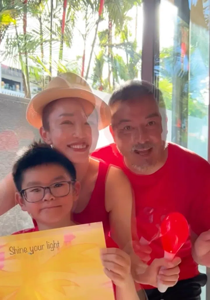 范文芳一家三口身穿红色,并以今年国庆日主题《Shine Your Light》为背景,录制了一段视频为新加坡庆祝58岁的生日。挥舞着荧光棒的阿姐,少女感十足~