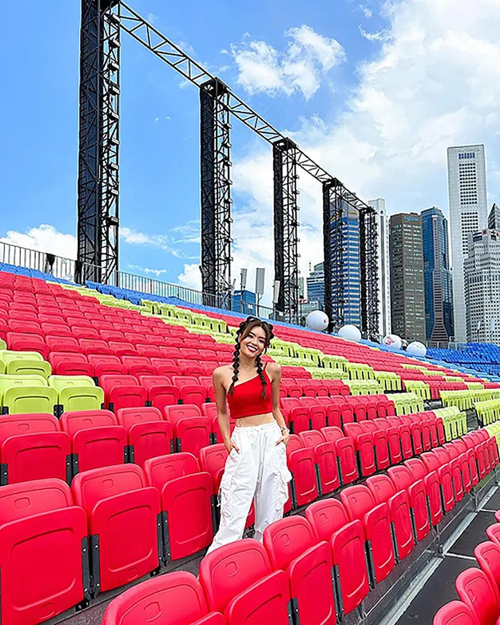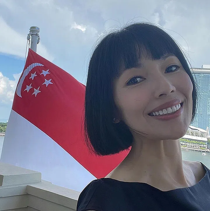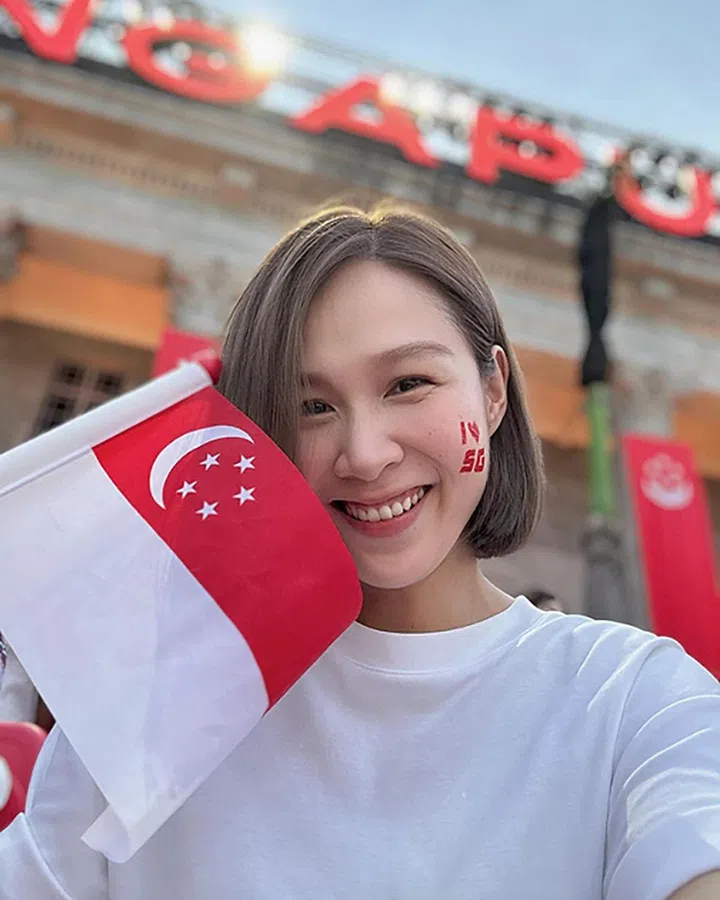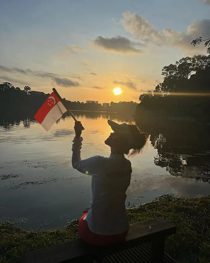 目前正居住在巴黎的欧菁仙,分享了一张前段时间回到新加坡与国旗的自拍。她发文祝新加坡生日快乐,诙谐表示在国外也要“表演”Kallang Wave和Lion Roar~