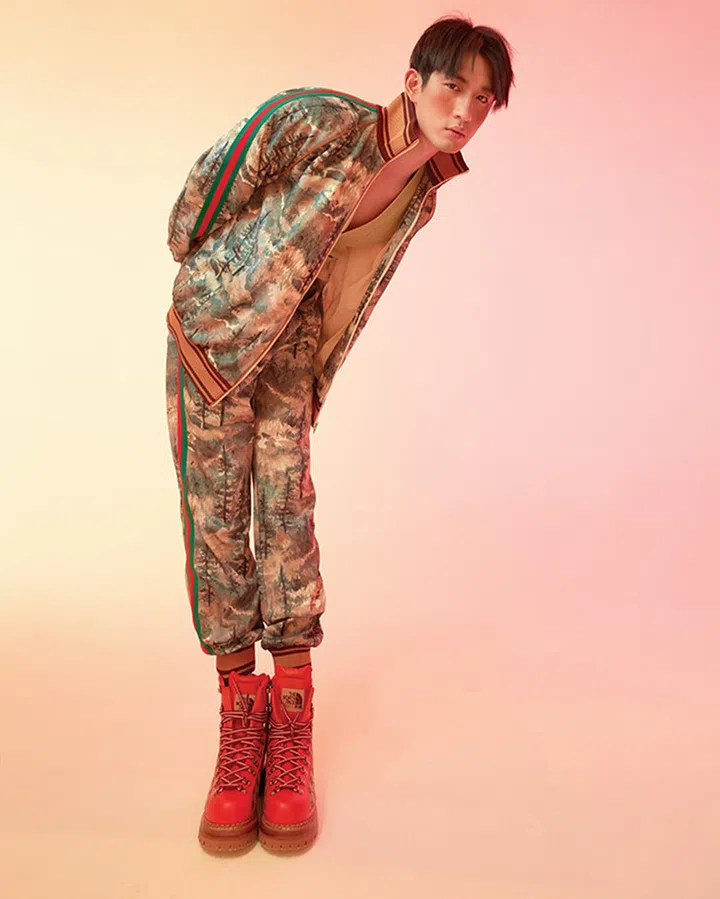 The North Face x Gucci人造丝及针织棉外套、 人造丝及针织棉长裤、 皮革及帆布鞋