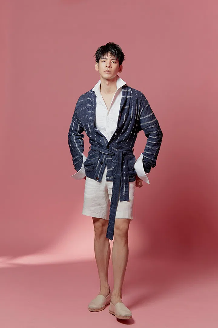林柏宏穿Ralph Lauren Collection棉质衬衫、针织棉麻外套、 麻质短裤、麂皮草编底鞋