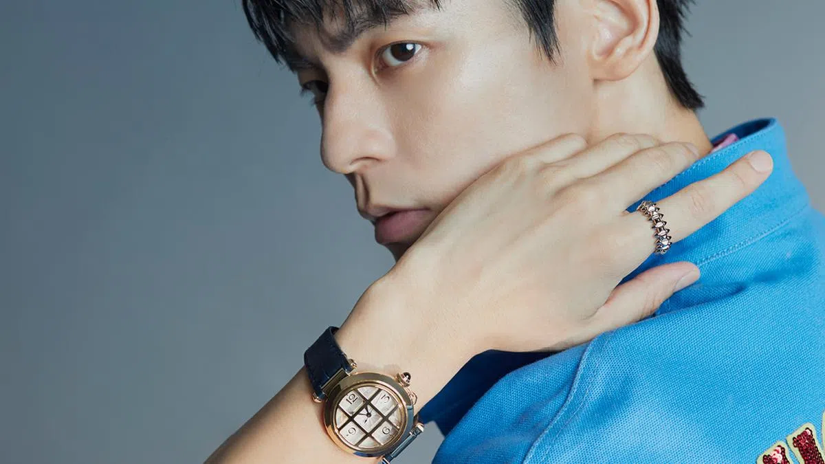 林柏宏穿Gucci缀饰棉质外套,Cartier Pasha de Cartier Grille搭载自动上链 机械机芯、41mm黄金表壳、 黄金可拆卸格栅、 可替换鳄鱼皮表带腕表,Clash de Cartier白金中型戒指