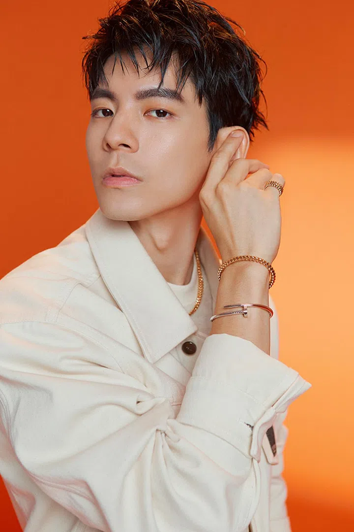 林柏宏穿Fendi棉质T恤、棉质外套、牛仔裤、皮革及麂皮鞋,Cartier Clash de Cartier玫瑰金双排戒指、 玫瑰金中型手链、 Just en Clou白金手镯