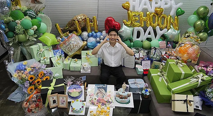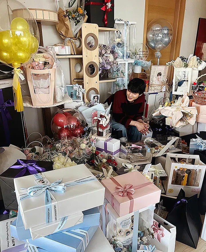 安孝燮以甜宠剧《社内相亲》从韩国火遍全亚洲,完美演绎“始祖鸟霸总”姜泰武,不仅俘虏女主角的心,戏外也圈粉无数。今年人气爆火后迎来第一个生日,他收到无数粉丝寄来的礼物,坐在礼物旁边露出开心的笑容,写道:“我觉得无法爱自己的话,就不能给予他人爱。大家真的给了我很多的爱。因为有你们在身边,所以我感到很幸福,感恩。”
