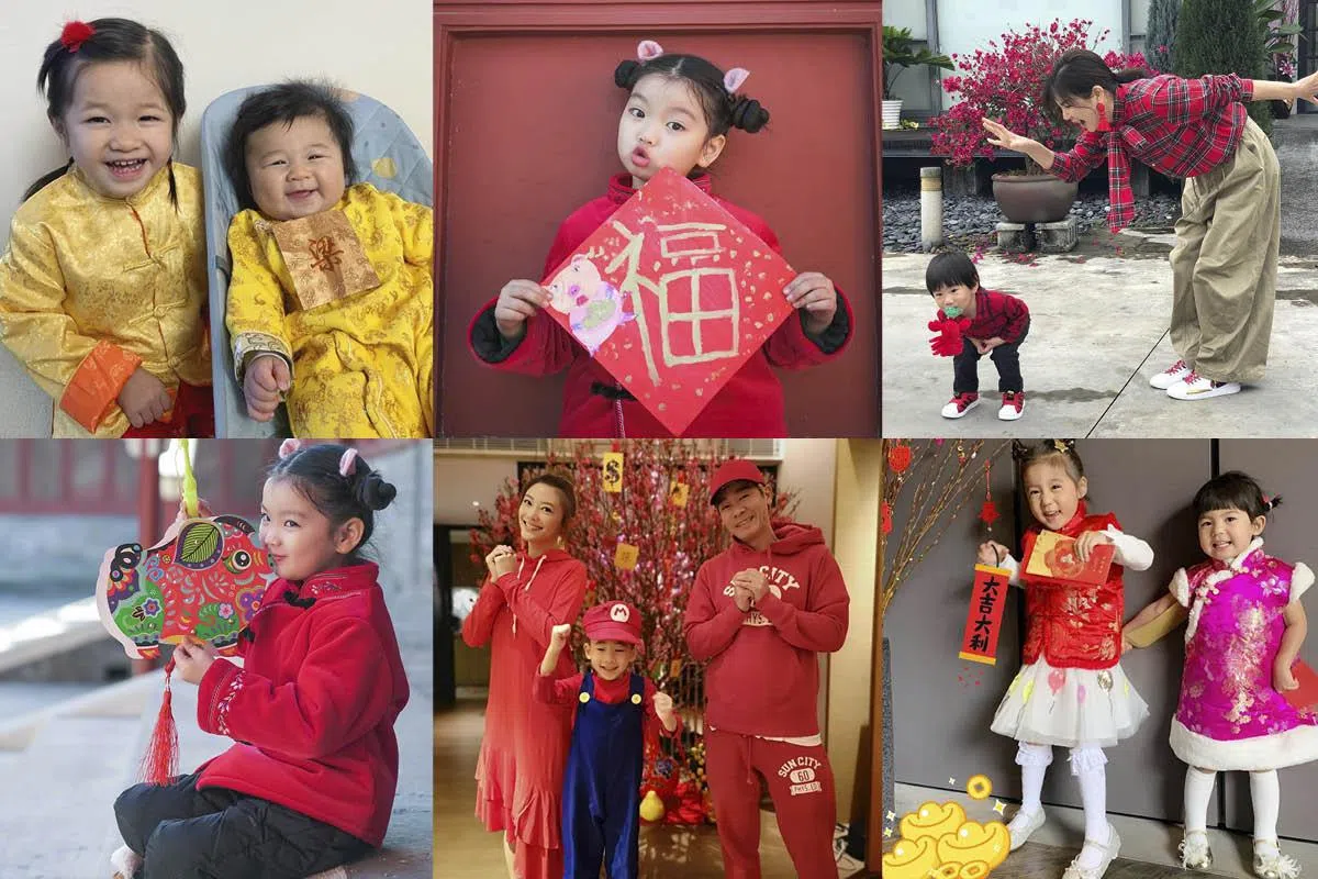 钟嘉欣则为一对儿女Kelly和Jared穿上传统服饰,姐弟俩还摆出同款眯眼笑,实在是太可爱啦!