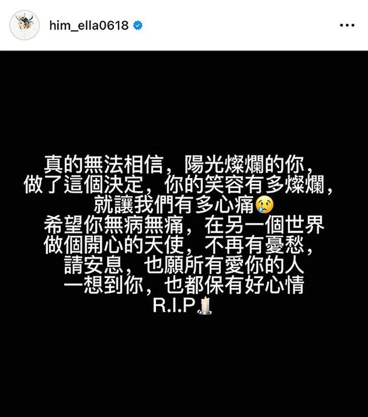 邓紫棋是最先发布悼念的明星之一:“我无法想像你经历了多少,无法想像你笑容背后藏著多少的痛,我会一直想念你。” 可见平日里笑的最开心的人也许是最痛苦的那个人。女友们在忙碌中也别忘了关心身边的亲友们,哪怕多一句问候,或多一个短信都可能帮助到他们。