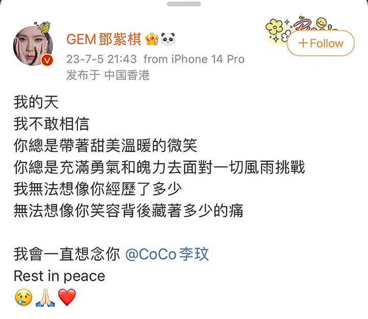 小编回想起前不久写过关于Coco李玟的文章,它们都是无比正面的——她健康的体态、她的唱跳、生活之道......每个都是值得我们学习的。因此她更是偶像们的偶像,对于她的离开,娱乐圈很多明星们都发文悼念。