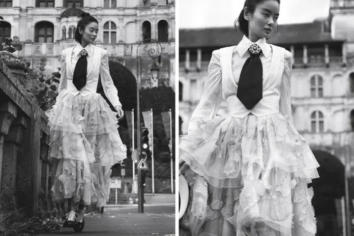 回顾《女友》2016年12月号在法国拍摄时,Sheila以俏丽的半丸子头短发,搭配Chanel三件式“绅士白纱”