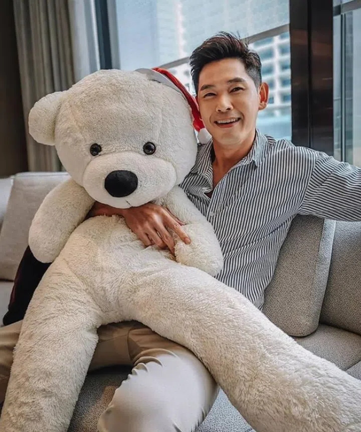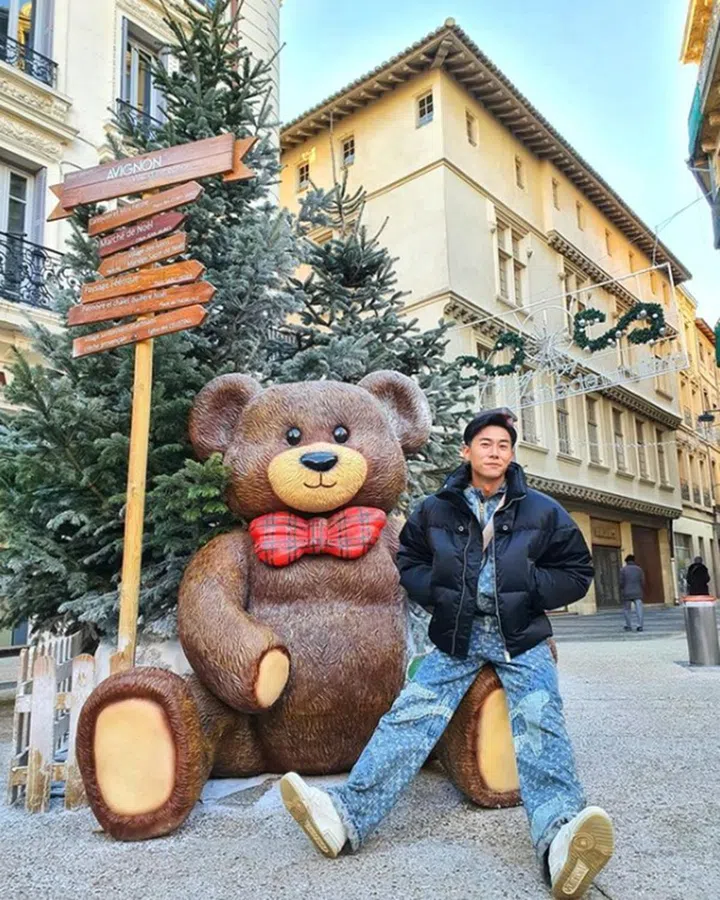 新婚的Desmond如今在法国度蜜月(看他的婚照),由于想保护圈外妻子的隐私,他的圣诞照里只晒出与路边雕塑熊的合影,让小编不得不留意到,本地男星今年的圣诞,难道都逃不开“熊公仔”的参与。