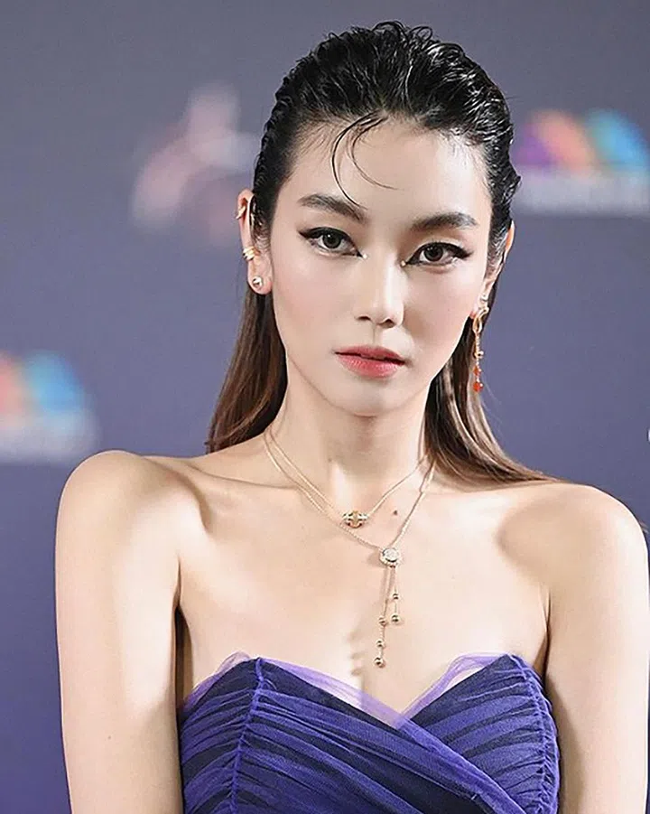 那晚,Sheryl变身狐系女孩,以一套梦幻紫的裙装搭配奶凶甜酷"狐狸眼"出席大奖。狐系眼妆整体呈现纤细上挑的趋势,不仅需要加长眼尾,还需把眼头画尖,很是妩媚。化妆师Clarence还在眼头贴了水钻,让妆容更加亮眼。
