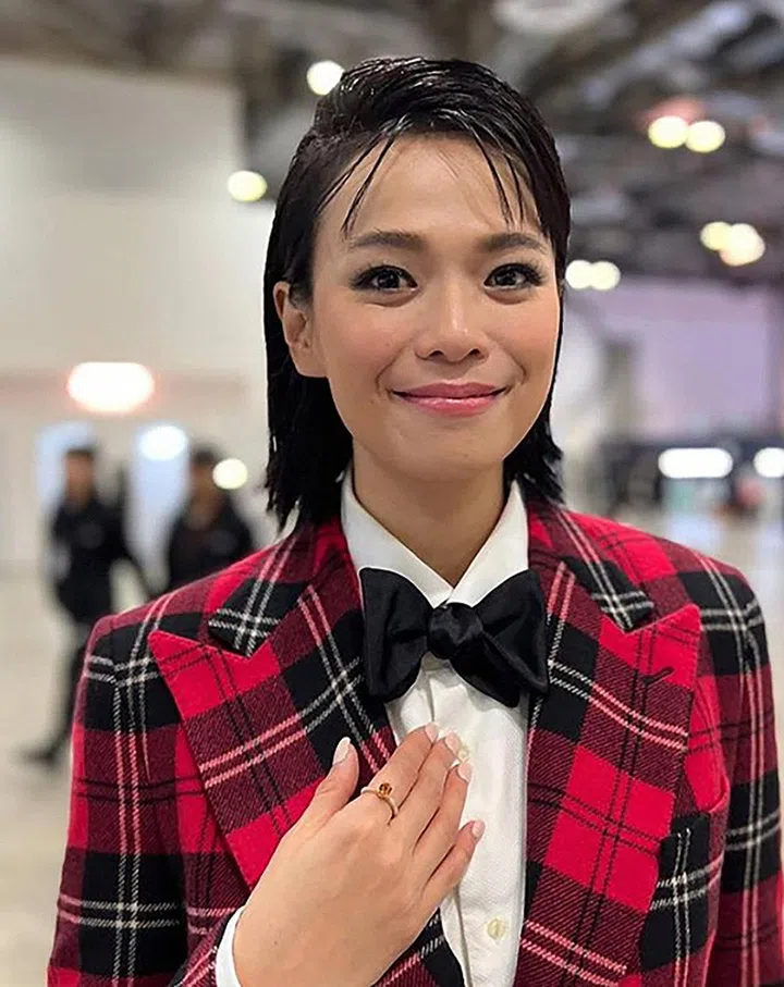 感觉平日里甜美活泼的Felicia变了…发型师将Felicia的齐刘海“一刀切”短发玩出了新花样,选择把刘海全部往后侧方向梳理,打造略带复古气息的帅气短发。眼妆方面也选用了冷色系的眼影打造时尚烟熏妆,眉毛则是野生眉。