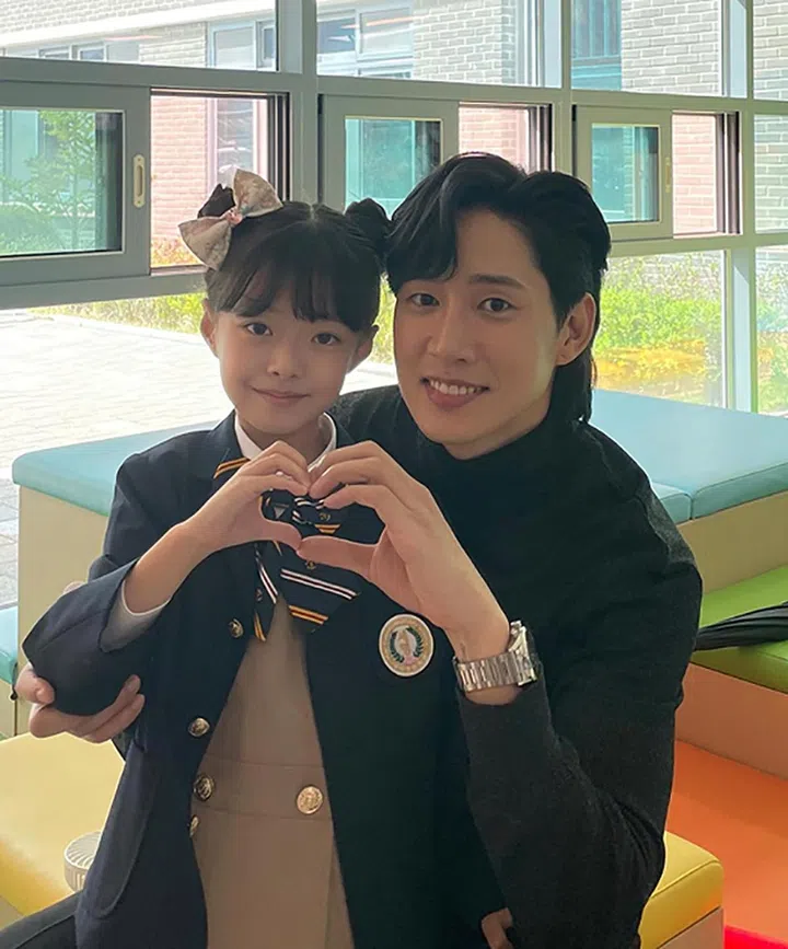 剧中他的角色嚣张跋扈,还带着一股狠劲,总让人感觉不寒而栗,不知道下一秒会做出什么疯狂事。私下的他绝对大反差,在IG分享和剧中女儿的合照,还一起手比爱心,温馨无比,勾出剧中演员的搞笑留言,林智妍:“远离我女儿”、金惠恩:“你太可怕了。”