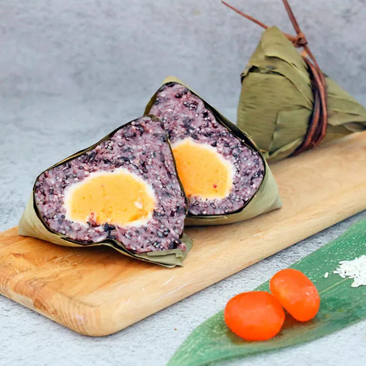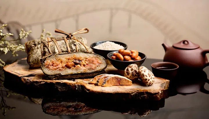 外形精美的紫米粽,内馅是奶香浓郁的卡仕达酱,口味清甜,老人小孩肯定都爱。若家中人多,不妨选择Shang Palace Rice Dumpling Gift Set粽子组合($78),包含4种口味的粽子及一盏中国茶,食用后帮助消化解腻,特别贴心。