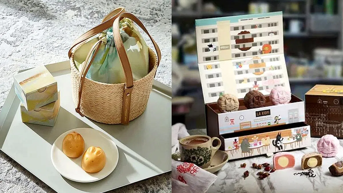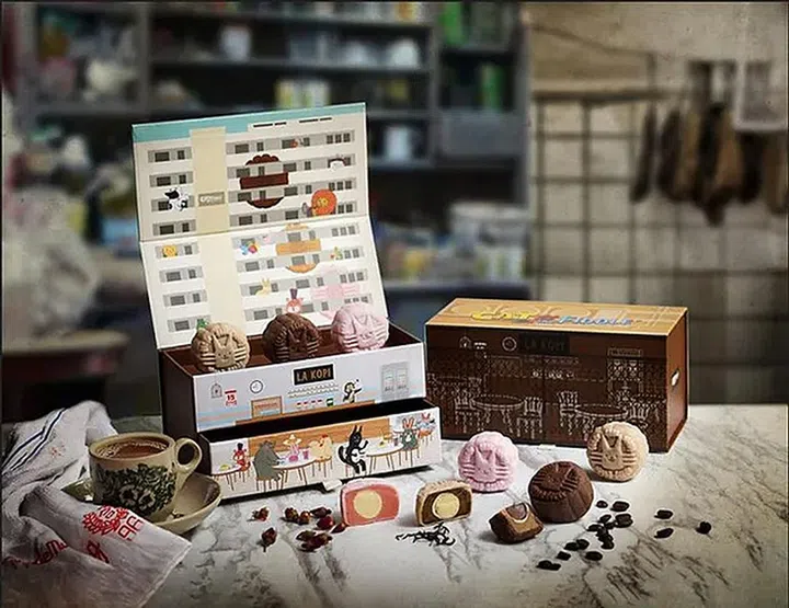 Cat & the Fiddle今年推出一系列以本地特色饮料为主题的月饼,包括Kopi Gao、冰奶茶和玫瑰露。礼盒也贯彻本土特色,印上文艺的插画图案,融入本地独特的组屋和咖啡店风景,充满巧思。每个月饼系列还附赠一个“Kopi Da Bao”袋(赠品送完即止)。