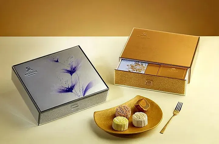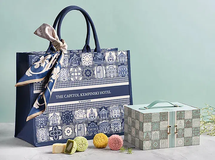 订购任何The Capitol Kempinski Hotel Singapore酒店推出的一组月饼礼盒,便可选择不同的精美礼盒包装,包括红色的Kempinskin Red Tin Box 铁盒或Jade Treasure Box珠宝盒。外观印有酒店怀旧建筑的特色图案,洋溢文艺复古风。你也可以选择额外付$58,入手精美的托特包(两种颜色红或蓝可选),同样缀有古早味的插图。