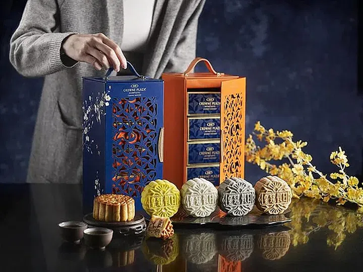 Crowne Plaza酒店今年推出两款礼盒,活泼元气的亮橘橙和优雅贵气的蓝色。缕空雕花长方形的盒装设计,顶端配有一个手柄,可以轻松提取。拿出月饼后,装入一个LED小灯泡,礼盒瞬间变成漂亮的灯饰,为中秋夜营造温馨氛围。