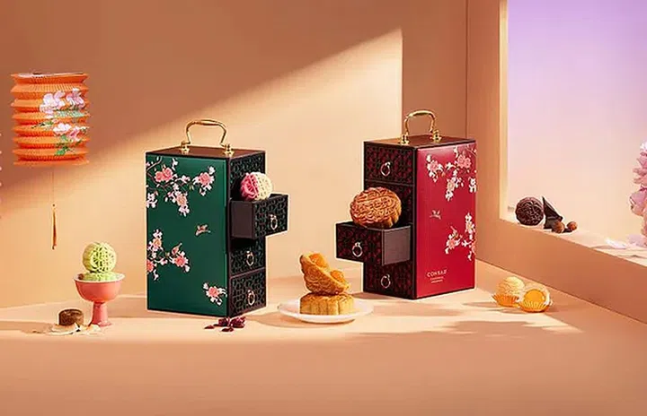Conrad Centennial酒店今年推出的月饼礼盒,充满东方韵味,有喜庆的红色和优雅的深绿色可选,共有4层抽屉格,吃完月饼留下礼盒,摆在角落也非常美观,作为零食收纳盒也十分称职。礼盒的外观以缎面织物覆盖,印有满月和花鸟图案,带有吉祥如意、宁和与健康的美好寓意。