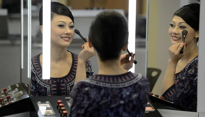 想不到吧,原来新航空姐的妆容也得配搭制服的颜色!穿蓝色制服的乘务员会画上偏蓝或棕调的妆容;穿绿色制服的高级乘务员可选择橄榄绿、梅紫色或棕调的眼影;穿红色制服的乘务长可以梅紫色或棕调的眼影;穿紫色制服的总舱务长则可以选择蓝色、梅紫色或棕调的眼影。