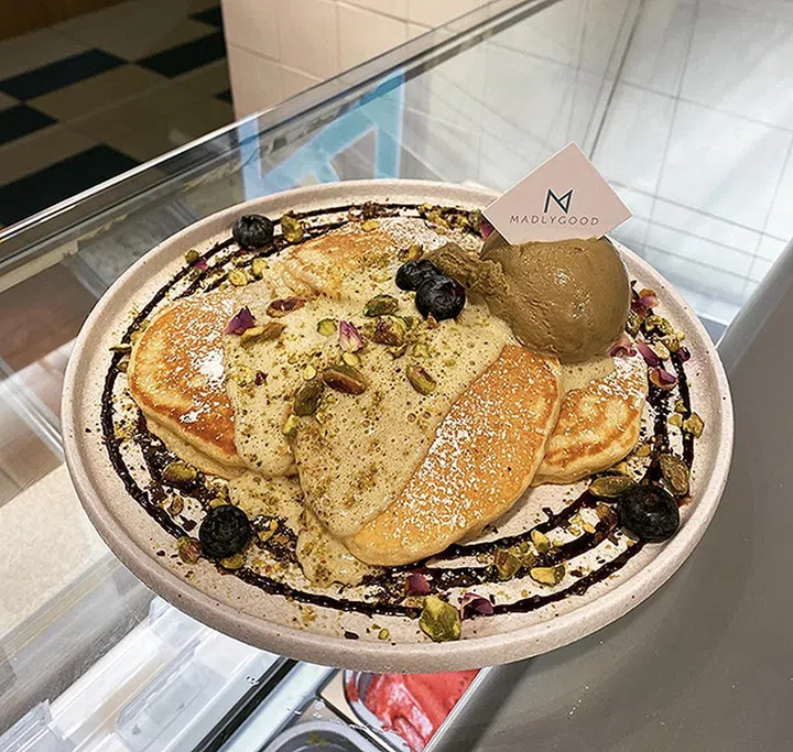 Madly Good向来专注于传统华夫饼,近期他们却也拓展menu,把麻薯华夫饼、软嫩的煎饼、多种口味的croffles都纳入菜单中来满足更多味蕾。图中是Pretty Pistachio Creme Pancakes,有开心果的香、奶油的甜和煎饼的软糯,搭配在一起刚刚好!