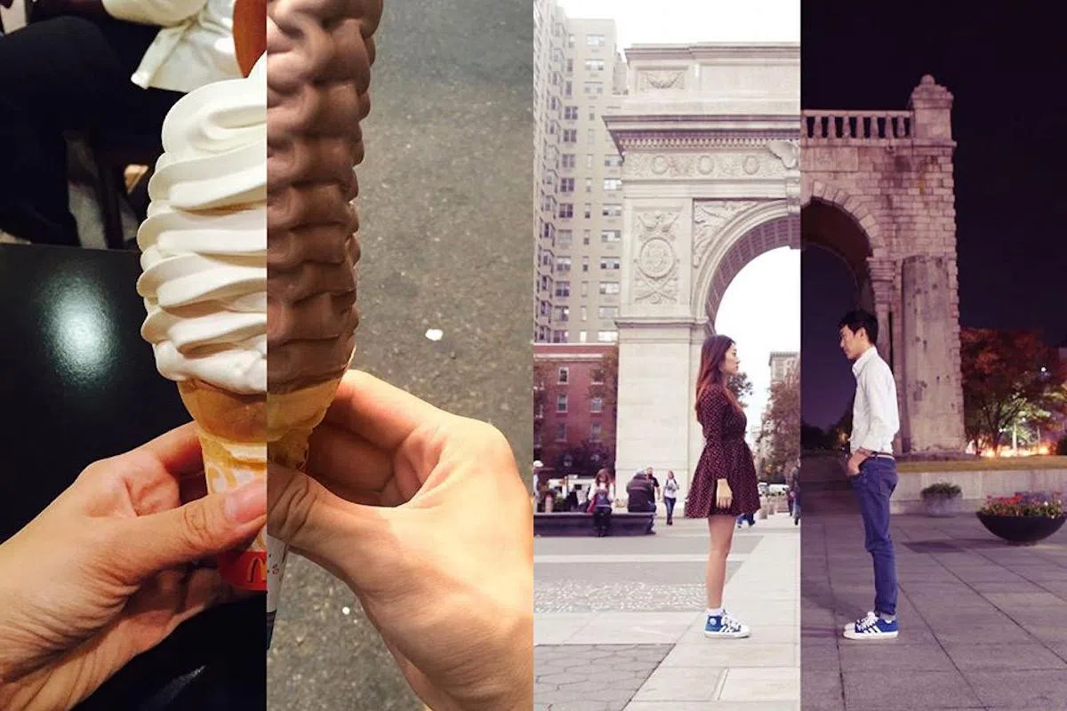 这类“穿越“情侣照,来源于一对远距离的韩国情侣。女孩住在美国纽约,男孩则来自韩国首尔,尽管远距离,但他们会约好在同个时间,以同一个主题,甚至是同一个角度拍下各自的照片,事后拼成一张“对半合照”。要知道,光是拍摄照片就要讲求艺术感,此外还得有毅力坚持去做,费时又费精力,若是无心,难以做到。