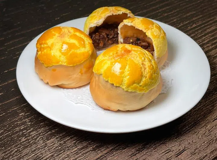 华乐酒家自1988年开始便推出这款经典菠萝包,历年来也改良过好几次,包括减少10%糖用量、以植物油代替5%的牛油,制作更健康的菠萝包。此外,自家制的港式蜜汁叉烧馅料,混合了猪颈肉和五花肉,不使用红色素,蜜汁烤制出深焦糖色泽,不会太甜,还能吃到香脆肉片,味道独树一帜。如果打包回家,不准备马上吃,建议你把菠萝包收入冰箱。点心师傅也建议大家不要用微波炉加热,最佳享用方式是用空气炸锅或烤炉,以180度加热3到4分钟即可。