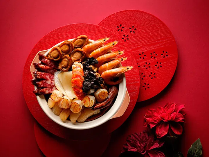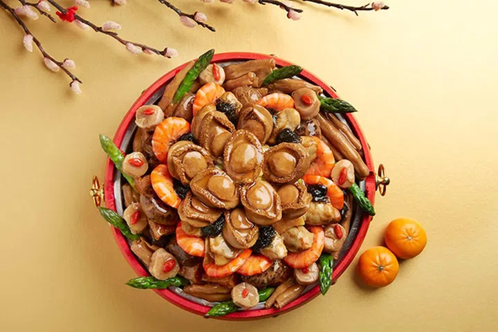 供外带的招牌围村家乡盆菜(小份$328,大份$598),包含多种新鲜食材如暴雨、鱼肚、海参、虎虾、扇贝、日本蘑菇、牡蛎干及烧肉,以代表吉祥的大红木制圆形容器装载,让你的新年盆满钵满!这样的“造型”让你社交媒体上的团圆饭照片,更诱人哦!