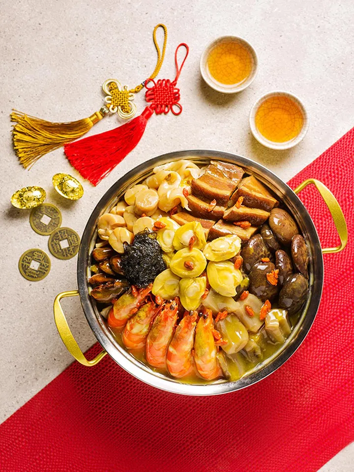 多年来收到食客喜爱的农历新年Bountiful Treasures Pen Cai 盆菜(小份$168+,大份$308+),拥有小鲍鱼、海参、鱼肚、干贝、牡蛎干、鲜虾、红烧肉、红烧菇、西兰花、白萝卜、芋头、海苔及枸杞子,口味超级浓郁鲜美。