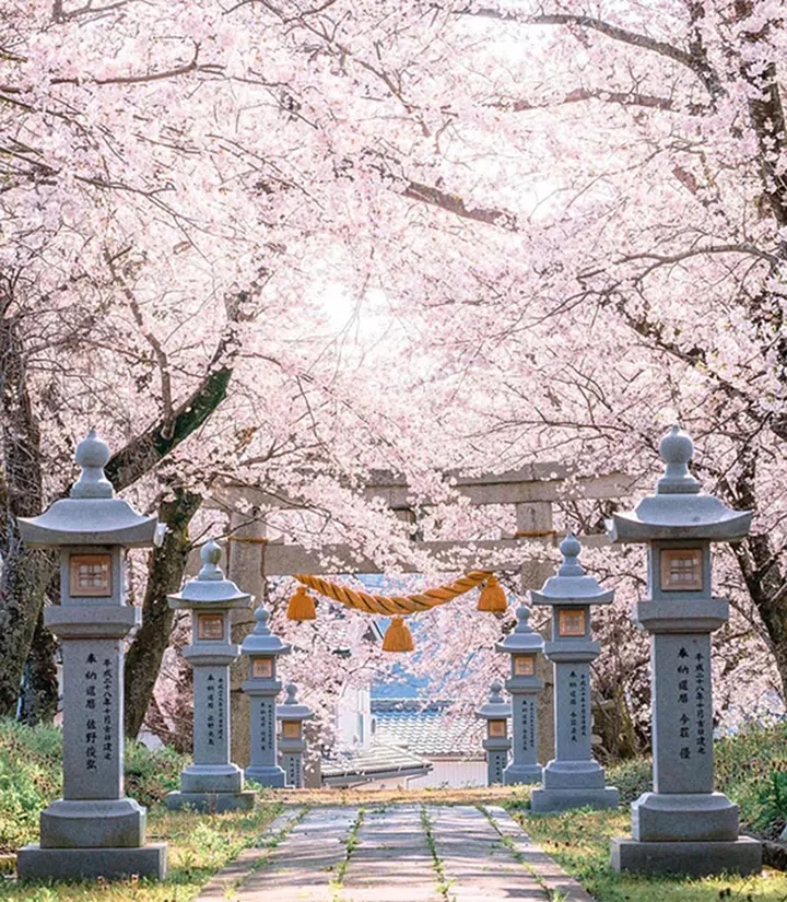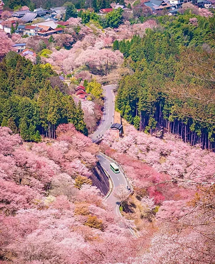 这里从4月中旬开始便成为了樱花花海。3万多棵樱花树随着吉野山的山间小路一路向上,花期也会根据海拔的不同延续1个月左右,大家也可以根据游玩时间和花期来选择吉野山上的不同赏樱地。最推荐的还是山顶,可俯瞰樱花,仿佛纵深花海,就连夜间的景色也值得一看。