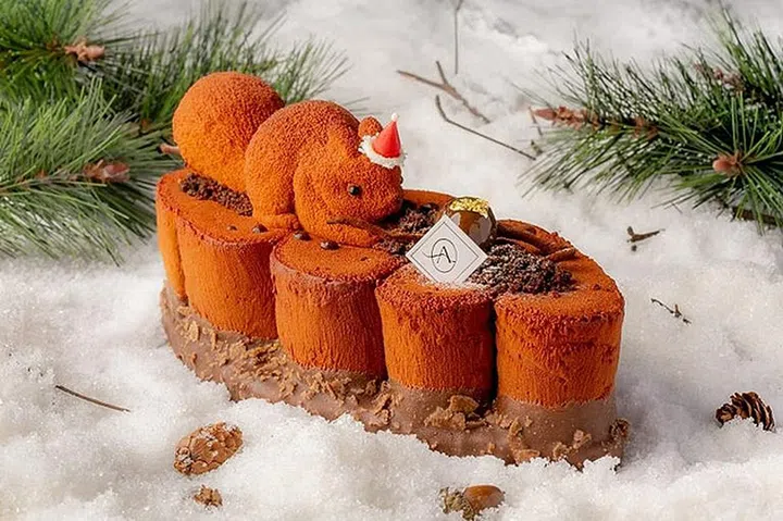 Alice Boulangerie今年推出的圣诞蛋糕超萌哒!由黑巧克力香橙慕斯打造的可爱又立体的松鼠蛋糕,可是在黑巧克力薄脆片之上藏有一层又一层的开心果慕斯、干果糖、清爽的樱桃蜜饯等等。