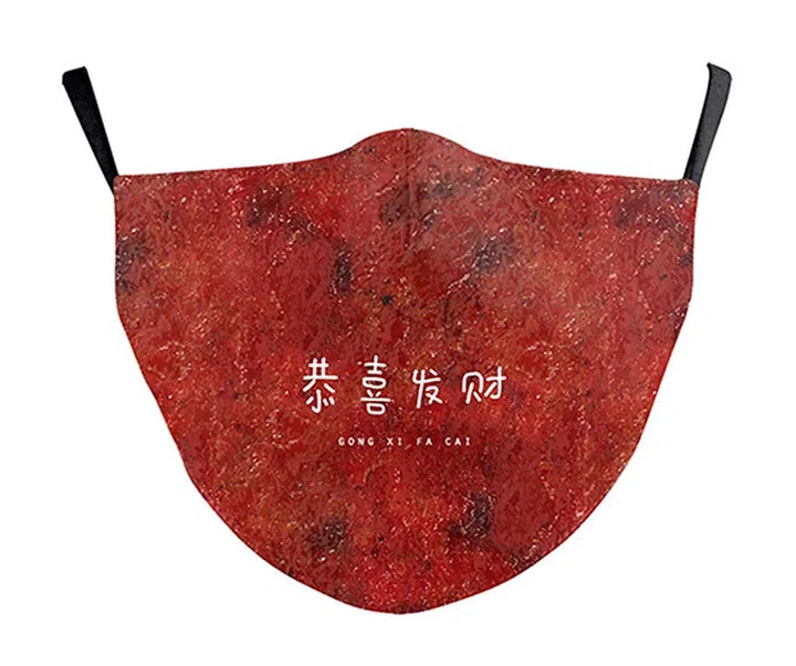 以肉干为灵感制作成的口罩,乍听匪夷所思,细品趣味十足。红底背景配上“恭喜发财”四个字,也特别适合内心玩味,但同时又社恐不敢开口拜年的人士。