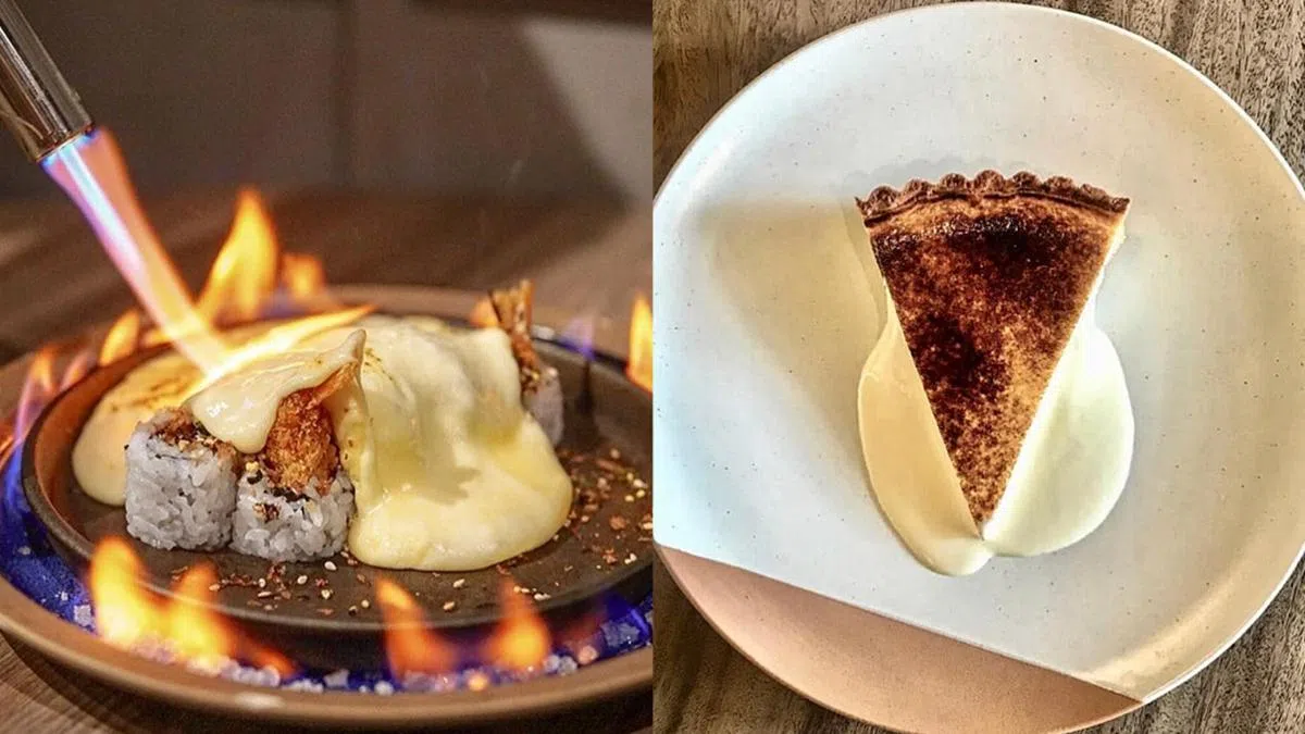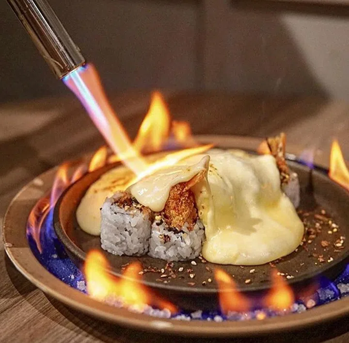 Hana本身就是一间很不错的日式料理餐厅,除了颜值高让你食欲满满,特别的还包括这盘芝士三文鱼寿司!上餐后,后厨人员会将寿司周围“点燃”,再将浓郁的芝士酱淋在寿司上面,为用餐仪式感加分。