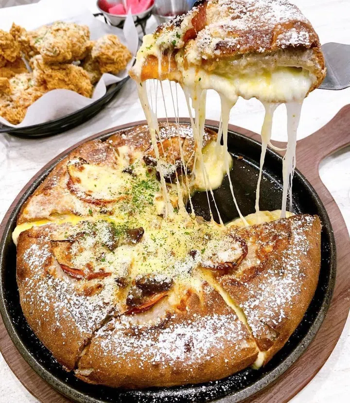Pizza Maru的招牌——Real Chicago Pizza,虽然看上去饼皮很厚,但其实里面被塞满了芝士夹心!夹在粗粮面皮中的芝士被烤过后融化,混合着红薯泥根本拉不断。搭配草莓果酱吃可与芝士中和,吃起来不会过于甜腻。