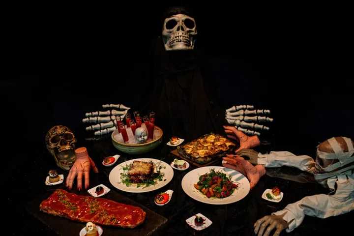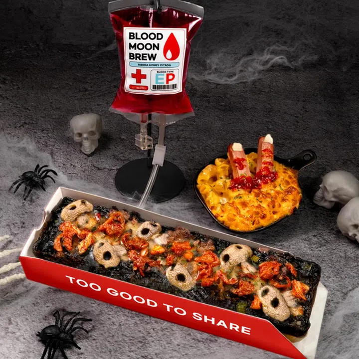 迷你蘑菇“骷髅头”、血腥“断指”香肠,再加上一袋神秘的“血液”饮料——这就是Eat Pizza为万圣节准备的恐怖大餐!别被外表吓到,虽然看起来惊悚,实际上它们可都是让人一口接一口的美味佳肴。Eat Pizza的“毛骨悚然盛宴”($16.70)有K-Chicky Shroom炭烧披萨($7.90),这款披萨不仅炭黑,还铺满了骷髅形的蘑菇;Mac & Bloody Fingers($4.90),奶酪通心粉配上超逼真的“断指”香肠,既好吃又有趣;还有用IV点滴袋盛装的Ribena柚子蜜饮品($3.90),让你喝到最后一滴都感到沉浸感满满。