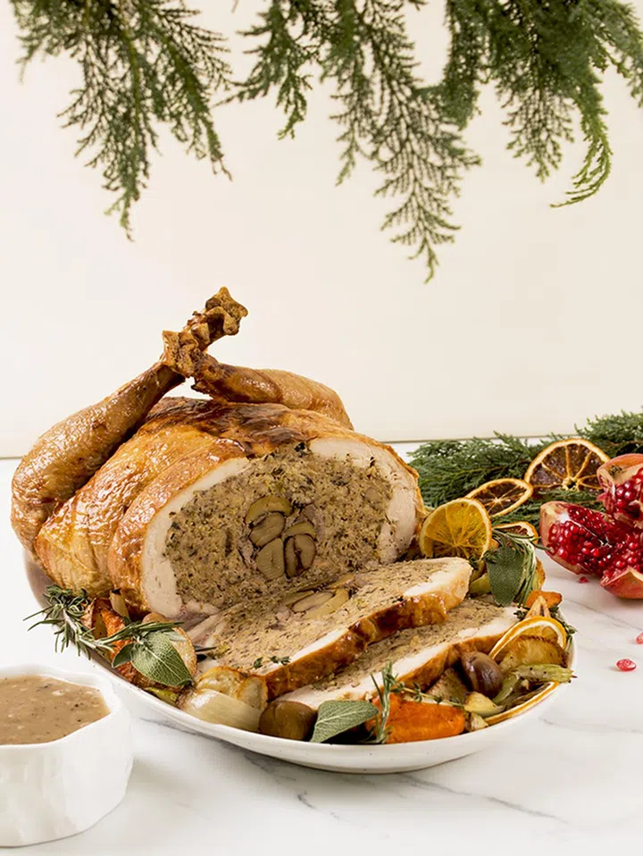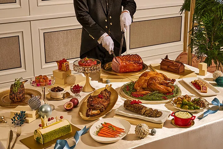 Meadesmoore Steakhouse 是新加坡的顶级牛排馆之一,今年圣诞节特别推出精选的节日菜单,增添节庆氛围。你可以品尝到 Sanchoku Wagyu Tomahawk Forestiére 和 Herb Crusted Turkey en Crepinette 等奢华主菜,搭配香浓的甜点 Strawberry Champagne Eton Mess。餐厅还提供节日外送套餐,当中包含图中的烤火鸡,让你也可以舒舒服服地在家和亲朋好友共享这份美味!