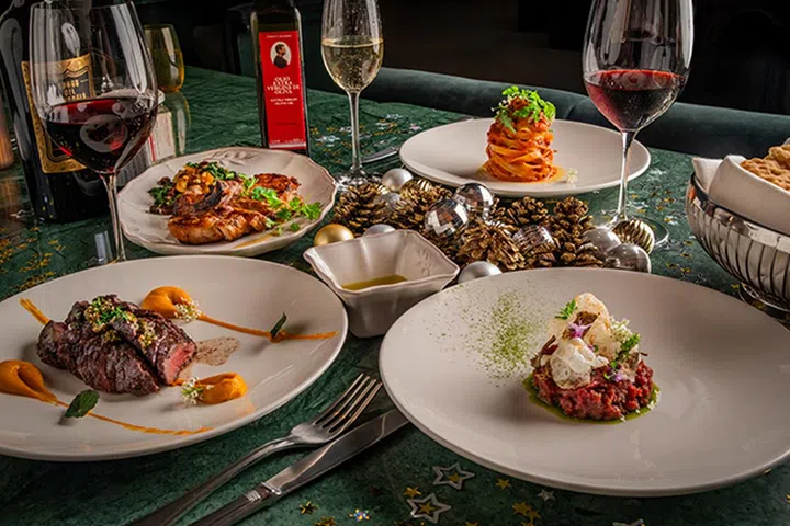 Bottega di Carna 是由意大利名厨 Dario Cecchini 和主厨 Kenny Huang 联手打造的餐厅,提供创意意式料理。今年圣诞节,餐厅推出了丰富的节日菜单,包括布拉塔芝士配无花果、红酒炖牛脸颊等午餐选择,以及包含北海道扇贝和松露牛肉塔塔的晚餐菜单。平安夜的五道式晚宴更加奢华,提供鱼子酱、鹅肝松露烩饭和顶级菲力牛排,带来无与伦比的味觉享受。