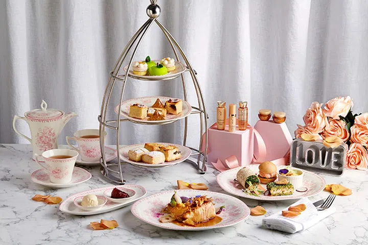 以Floral Blush为主题的下午茶套餐,其中许多甜点的灵感和名称都来自于花朵,包括Lavender Swiss Roll、Rose Raspberry Chocolate Petite Cupcakes等。连主推的茶水都是在外不常见的Jasmine Silk Pearl and Rose of Ariana花茶(当然女友们也可以选择其它种类)。
